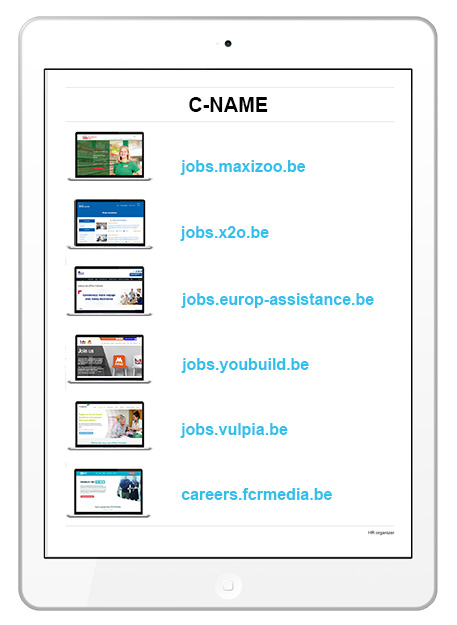 "Le c-name est une extension qui se place avant votre nom de domaine. Si votre nom de domaine est https://sociétéX.be vous pouvez ajouter un mot spécifique comme par exemple : https://jobs.sociétéX.be ."