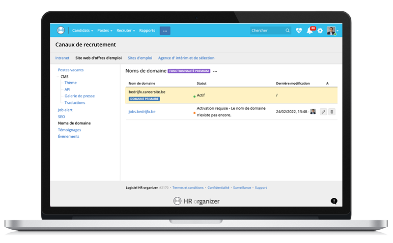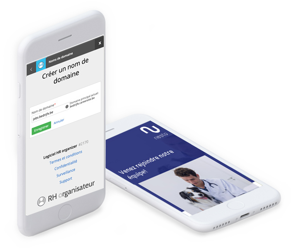 "Vous pouvez créer vous-même votre propre nom de domaine ainsi que votre c-name. Vous décidez dans quel environnement apparaissent vos offres d'emploi et vos infos sur les données, les valeurs, la culture, ... de votre entreprise. Par défaut, tous les sites d'emploi se trouvent chez HR organizer sur le lien : https://nomdesociété.careersite.be"
