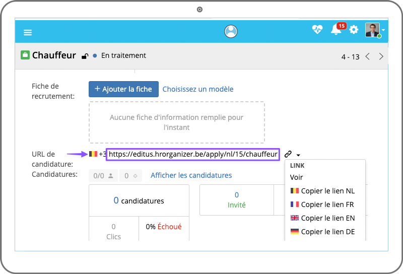 HR organizer peut être relié à votre propre site web via a une demande d'emploi URL