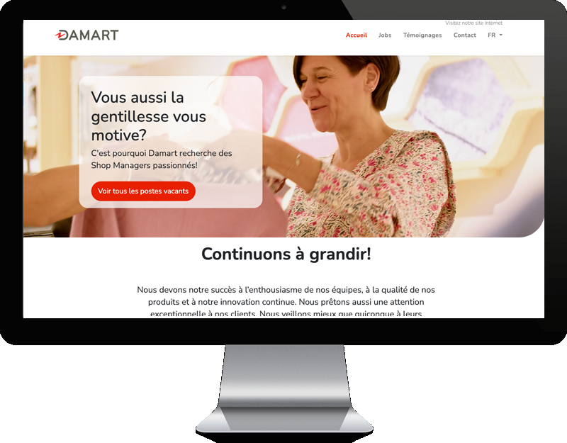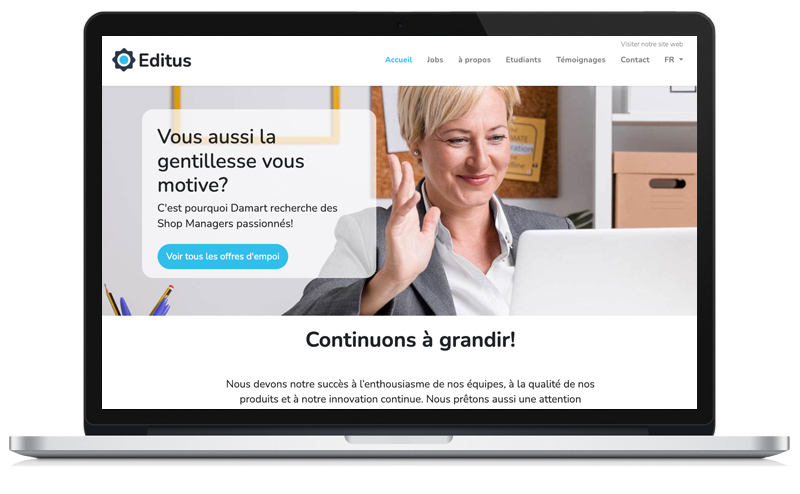 Votre département ressources humaines est le gérant du site carrière. Cela vous donne l'opportunité de communiquer vos valeurs, votre culture, vos atouts et bien sûr les postes à pourvoir au sein de votre société. Vous gérez vous-même le site d'emploi et vous êtes directement lié à la plateforme cloud de votre HR organizer. La structure des pages peut être modifiée avec les blocs d'information du site carrière. Des pages et des fonctionnalités supplémentaires peuvent bien sûr être ajoutées moyennant supplément de prix.