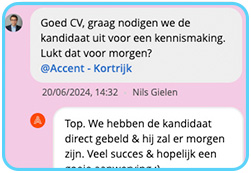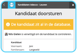 Een kantoor krijgt onmiddelijk de melding als de kandidaat reeds in jouw databank zit. Uiteraard beslis je nog zelf welk vervolg je geeft. Geen discussies meer over wie eerst was.