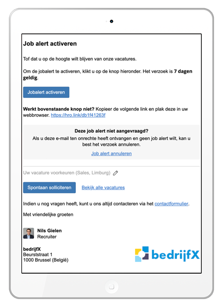 De kandidaat dient, na het versturen van zijn of haar gegevens de jobalert te activeren. Hiermee voorkomen we dat iemand zomaar een e-mailadres ingeeft.