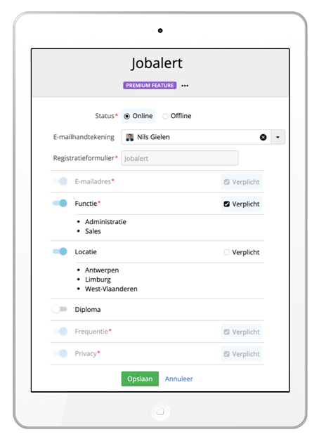 U kan uw jobalert zelf ingeven en beheren. U kan de kandidaten verschillende velden laten invullen en ook aanduiden of deze velden verplicht dienen ingevuld te worden.