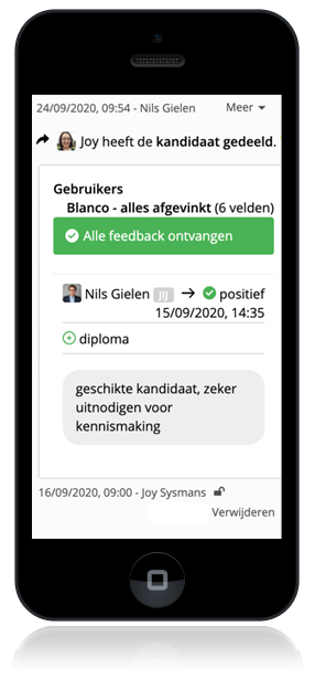 Uw collega's kunnen de gedeelde kandidaten bekijken en scoren zodat u een zicht krijgt op de meest geschikte sollicitanten.