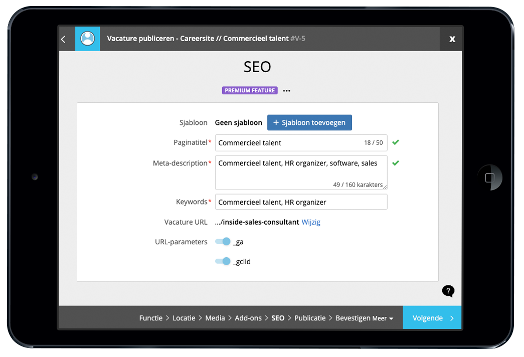 Vanuit het cloudplatform voorziet HR Organizer de nodige SEO-instellingen om ervoor te zorgen dat uw vacatures goed gevonden worden. Met deze functie kunt u de SEO verder uitbreiden voor een nog beter resultaat.