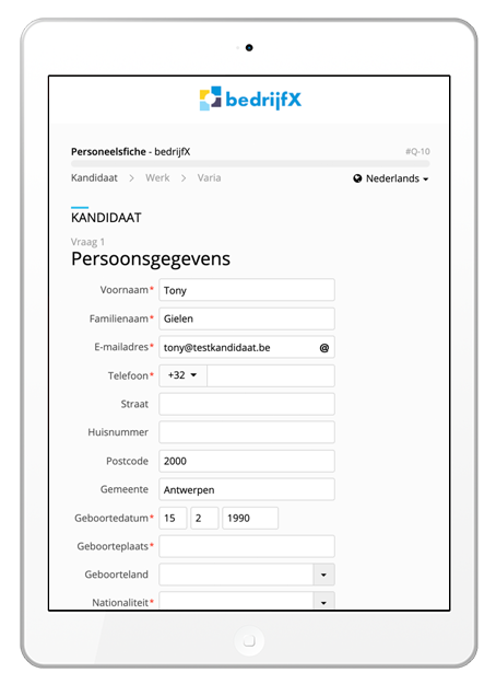 Hetgeen de kandidaat ingevuld heeft bij sollicitatie wordt terug getoond. Hij of zij kan deze gegevens wijzigen of verbeteren zodat, bij aanwerving, de juiste gegevens worden aangeboden aan payroll.